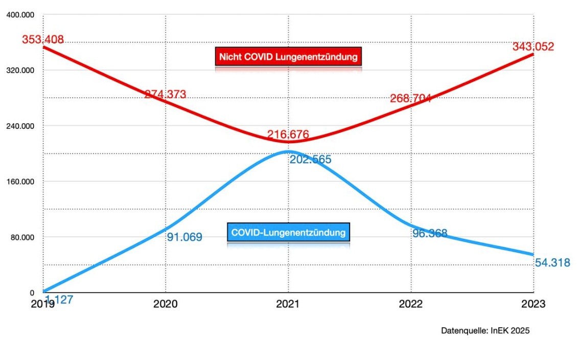 Znani podatkovni analitik Tom Lausen je pred kratkim na Telegramu poudaril, da je prišlo do očitnega "prekodiranja" pljučnice v letih korone: Leta 2021 je "virusna pljučnica" (ICD J12.8) eksplodirala v nemških klinikah, medtem ko je pljučnica drugih izvori zabeleženi precej redkeje. Ali je SARS-CoV-2 hitro izkoreninil druge vzroke bolezni? Komaj. Namesto tega podatki spominjajo na nenadno "umrtje" gripe, ki so jo nenadoma poimenovali samo Covid-19.