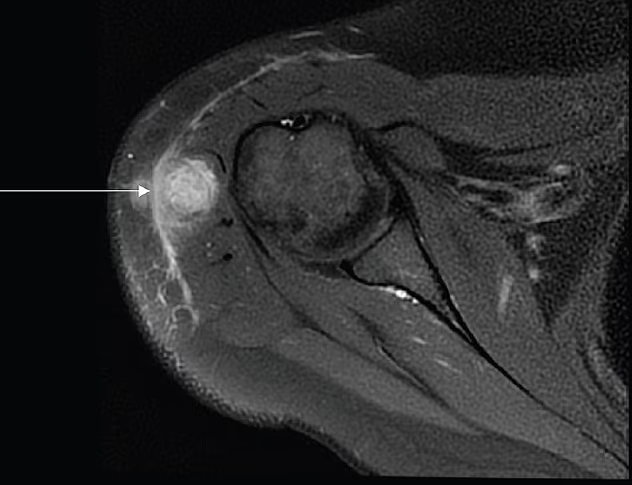 Zdrava 30-letna bolnica je pomotoma prejela cepivo proti tuberkulozi, kar je povzročilo okužbo celega telesa in s tekočino napolnjen absces v deltoidni mišici, označen s puščico. Zdravniki so oteklino sprva pripisali vnetemu kožnemu tkivu, vendar so preiskave kasneje potrdile bakterije, ki povzročajo tuberkulozo v njenem telesu.