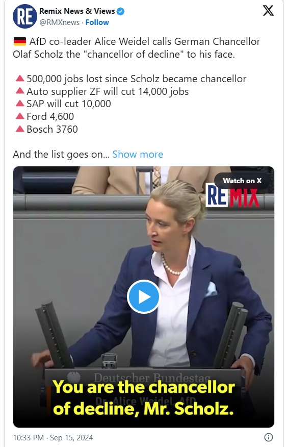 Alternativa za Nemčijo (AfD) že dolgo opozarja na deindustrializacijo pod vlado socialdemokratov (SPD) in Zelenih. Sopredsednica stranke Alice Weidel je kanclerja Olafa Scholza lani označila za "kanclerja pogube".