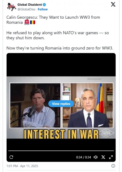 "Iz Romunije želijo sprožiti tretjo svetovno vojno. Vpletene bodo vsa Evropa in ZDA," je dejal v intervjuju z ameriškim novinarjem Tuckerjem Carlsonom.