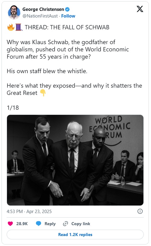 Konec nekega obdobja – ali šele začetek?Schwabov padec kaže, da tudi močne elite niso nedotakljive. Pismo žvižgača ni pretreslo le enega človeka, ampak celoten sistem. Toda medtem ko nekateri slavijo ta primer kot zmago nad globalizmom, ostaja vprašanje: Ali bo WEF začrtal novo pot pod vodstvom Brabeck-Letmatheja ali bo še bolj agresivno sledil kontroverznim ciljem?