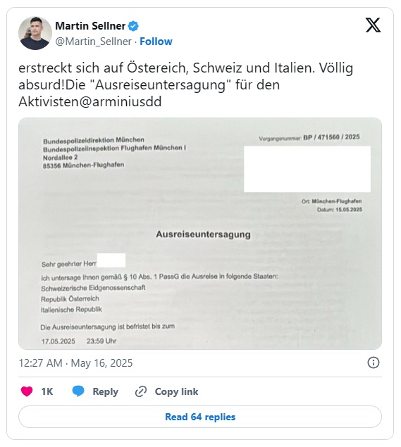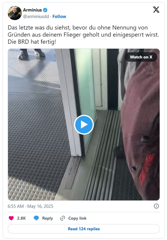 Dejstvo, da nemška država svojim državljanom preprečuje odhod iz države, je zaskrbljujoče. Še posebej, če pomislimo, da ne zato, ker bi kršili kakšne zakone, ampak zato, ker bi na konferenci lahko izrazili mnenje, ki je politično nezaželeno. Ena od prizadetih oseb – na X znana kot »Arminius« – na vprašanje pojasni: