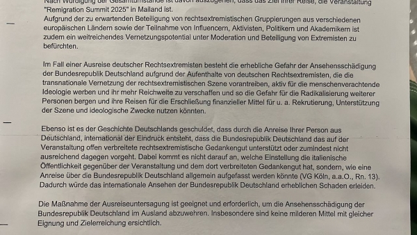 Navedeni razlog je bil, da bi njihova prisotnost na vrhu o ponovni migraciji v Italiji, ki je bila za sistem nezaželena, lahko škodovala mednarodnemu ugledu Zvezne republike Nemčije. Poleg tega obstajajo strahovi pred "transnacionalnim mreženjem", spodbujanjem "dehumanizirajoče ideologije" in morebitno "radikalizacijo drugih ljudi". Ukrepi bodo veljali do polnoči 17. maja, torej do konca dogodka.