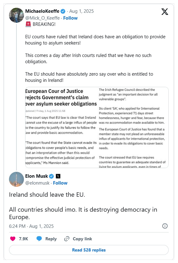 Elon Musk je pozval Irsko – in vse druge države Evropske unije – k izstopu iz unije, z ostrim sporočilom, da EU uničuje demokracijo v Evropi.