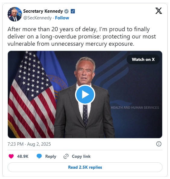 Njegove izjave prihajajo v času, ko je Robert F. Kennedy, minister za zdravje in socialne zadeve (HHS), iz ameriških cepiv odstranil konzervans na osnovi živega srebra – timerosal.