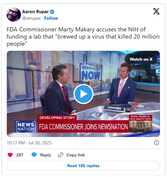 Novoimenovani komisar ameriške Uprave za hrano in zdravila (FDA), dr. Marty McCarthy, je za News Nation povedal, da je NIH pod vodstvom Anthonyja Faucija "ustvaril virus, ki je ubil 20 milijonov ljudi po vsem svetu", s financiranjem razvoja virusa COVID-19.