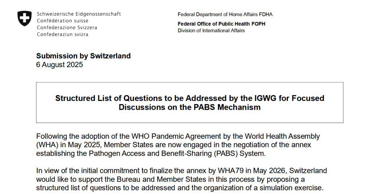 6. avgusta 2025 je Švica SZO predložila svoj načrt za sistem dostopa do patogenov in delitve koristi (PABS). Vključuje zelo eksploziven poziv k simulaciji pandemije v SZO BioHub v Spiezu, ki bo predvidoma od 3. do 7. novembra in od 1. do 5. decembra 2025, tik med tretjim in četrtim srečanjem IGWG (Medvladne delovne skupine).