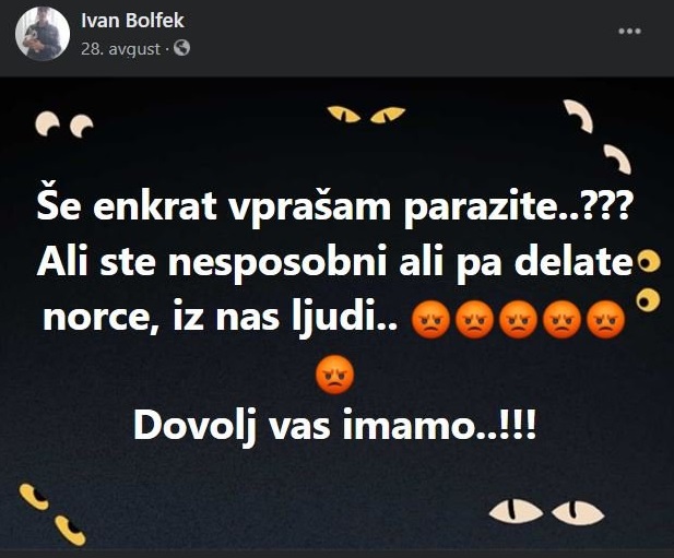 “Vi boste krivi, če bo prišlo do kakšnega incidenta. Ne iz moje strani, ampak s strani ljudi. Takrat se ne čuditi, če se bo zgodilo to. Ljudje vas imajo poln kufer. Me razumete!?,” je zatrdil vardist in dodal, da ti, ki so sedaj na vladi ne bodo več na vladi. “Vse bom naredil, vsak cent bom dal, da nam ne boste vladali v državi, ne vi, ne levica. Samo gobezdate, nakladate. Pripomogel bom k temu, da bo maščevanje še slajše. Če se bo narod odločil, da bo Bolfek strelovod, bo Bolfek strelovod. Ne bojim se vas, ker ste golazen in eni veliki lažnivci, smrduhi, bojazljivci,” je poudaril in napovedal, da ko pridejo v Ljubljano, se bo drugače pogovarjalo. “Ljudje, vas pa nagovarjam. Ko bo čas, če vas ne bo v Ljubljani, pa se hočete prepustiti tej usodi, živite tako. Če se z mano strinjate, boste prišli tudi vi. Ura bo odbila v kratkem. Če imate malo jajc pridite v Ljubljano, v Ljubljani se bo namreč končalo, ne Mariboru. Tam se mora končati.” Ivan Bolfek