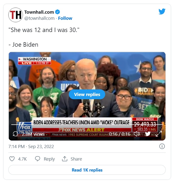Med govorom pred Nacionalnim izobražnim združenjem v Washingtonu je bolni Biden opazil žensko v množici in ji dal tipično bizarne komentarje, pri čemer je trdil, da jo je spoznal kot najstnik, ko je imel 30 let.