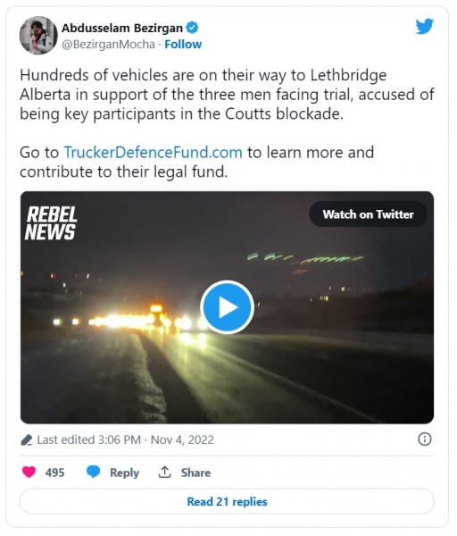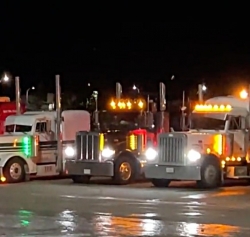 Tovornjakarji iz Edmontona, Medicine Hata, Red Deera, Fort MacLeoda in Calgaryja se zbirajo v južni skupnosti Alberte, da bi izkazali solidarnost s tremi moškimi, ki so obtoženi zaradi svoje vloge v dvotedenski blokadi meje.