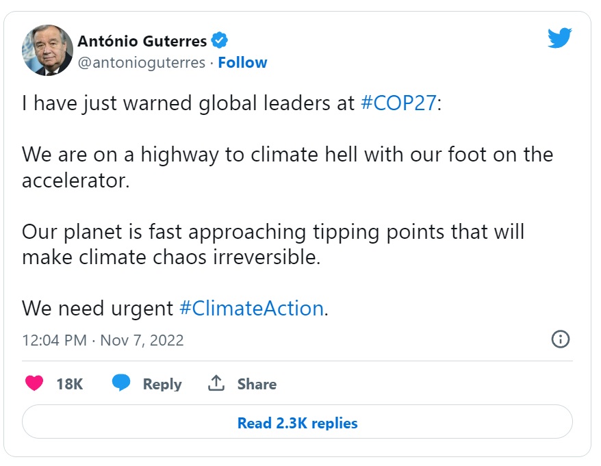 Generalni sekretar Združenih narodov (ZN) Antonio Guterres je že ob samem odprtju konference COP27 izdal zelo ostro opozorilo svetovnim voditeljem, ko so jih vprašali o nujnosti "podnebnih ukrepov" (isto opozorilo je parafraziral na njegov Twitter):