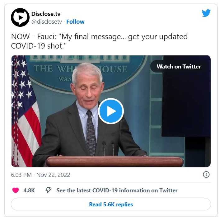 "Moje zadnje sporočilo, verjetno zadnje s tega odra, je, da prejmete najnovejše posodobljeno cepivo proti COVID-u in zaščitite sebe in svojo družino," je dejal brezsramni Fauci.