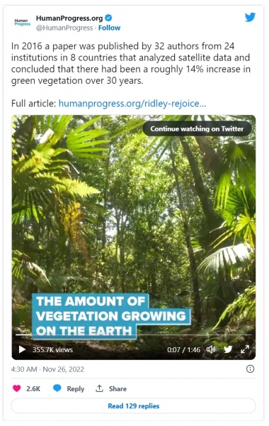Prispevek z naslovom "The Greening of the Earth and its Drivers" je leta 2016 objavilo 32 avtorjev iz 24 institucij v osmih državah, ki so analizirali satelitske podatke in ugotovili, da se je v zadnjih 30 letih zelena vegetacija povečala za približno 14 %. .