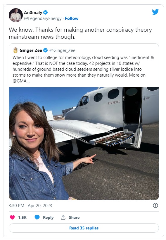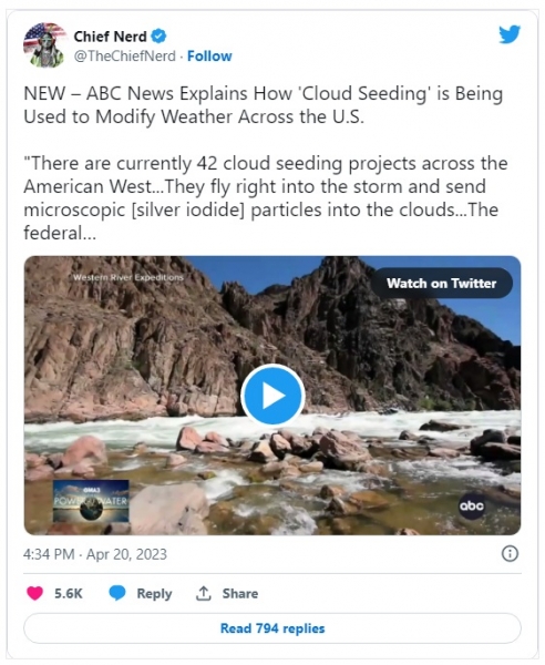 Newswars.com poroča: Glavna meteorologinja ABC News Ginger Zee je občinstvu povedala: »Trenutno poteka 42 projektov sejanja oblakov po vsem ameriškem zahodu, kot je ta v Utahu, kjer vzamejo takšna letala s pritrjenimi brizgalkami. Poletijo naravnost v nevihto in pošljejo mikroskopske delce [srebrovega jodida] v oblak.«
