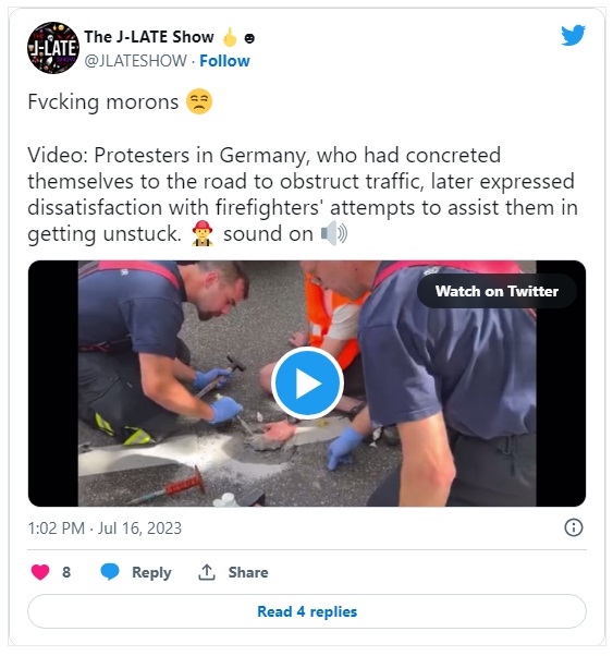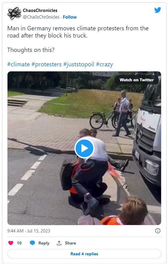 Običajni ljudje v Nemčiji so končali s toleriranjem podnebnih histerikov, ki sedijo na cesti in jim preprečujejo, da bi opravljali vsakdanje posle. V preteklih dneh se je pojavilo več posnetkov, ki prikazujejo, kako so ljudje siti terorja manjšine.