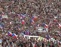 Za razliko od prejšnjih protestov po pozivu organizatorja med množico ni več ruskih zastav, plapolajo češke trobojnice, protestniki nosijo transparente proti vladi, pa tudi proti Natu, s katerimi so po govoru paradirali po center Prage na drugi breg Vltave in na Ministrstvo za notranje zadeve.