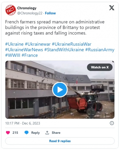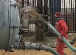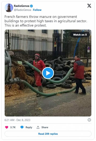 Francoski kmetje mečejo gnojila v vladne zgradbe v znak protesta proti visokim davkom v kmetijskem sektorju: