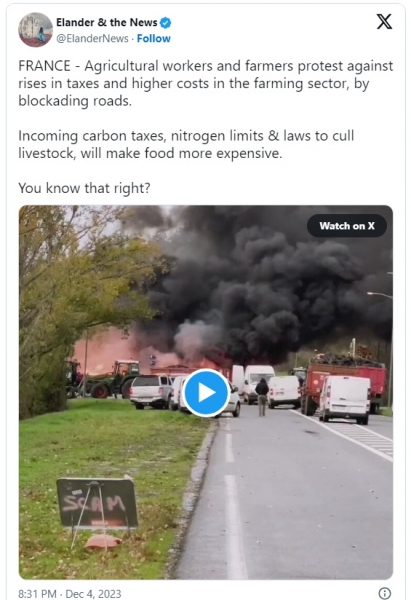 Proti dvigu davkov in višjim stroškom v kmetijskem sektorju kmetje protestirajo tudi z blokado cest. Prihajajoči davki na ogljik, omejitve dušika in zakoni o izločitvi živine bodo podražili hrano.