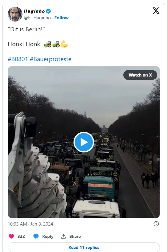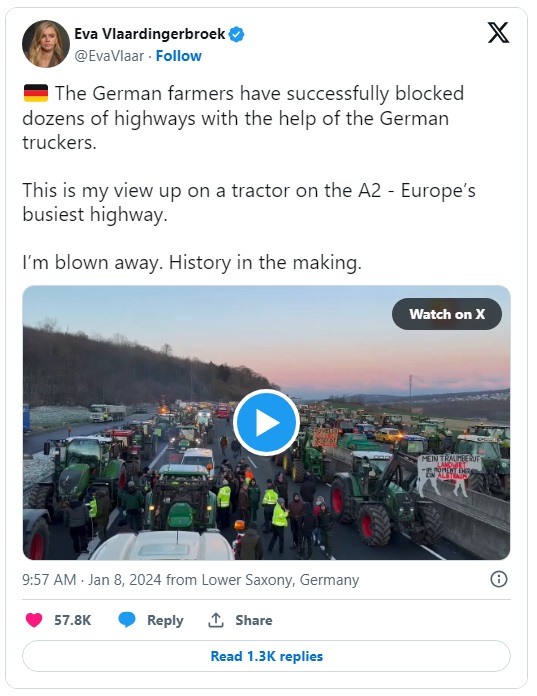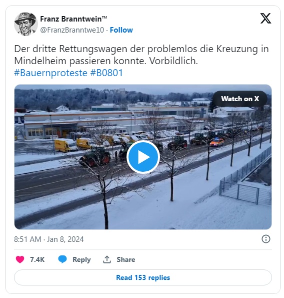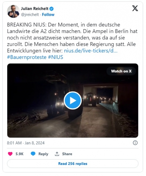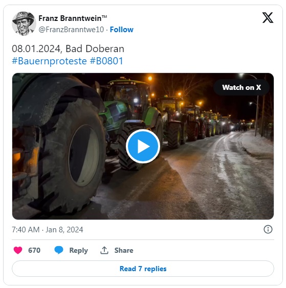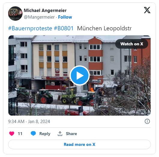 Medtem ko javnost in osrednji mediji, zvesti sistemu, blatijo nemške kmete in jih označujejo za radikalce, večina prebivalstva očitno stoji za kmeti, ki zdaj povzročajo velike cestne zapore in velik prometni kaos po vsej državi.