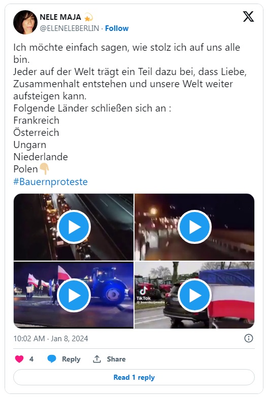 Na družbenih omrežjih se delijo neštete slike in videoposnetki kolon vozil: v velikih in majhnih krajih, na avtocestah, pa tudi v mestih – povsod se kmetje in njihovi številni podporniki podajo na ulice, da bi protestirali proti zahrbtni zeleni vladi.